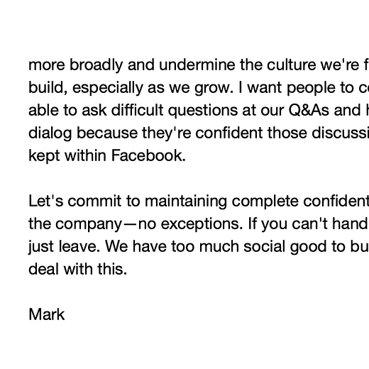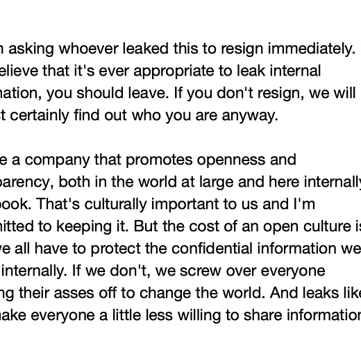 We are a company that promotes openness and transparency, both in the world at large and here internally at Facebook. That's culturally important to us and I'm committed to keeping it. But the cost of an open culture is that we all have to protect the confidential information we share internally. If we don't, we screw over everyone working their asses off to change the world. And leaks like this make everyone a little less willing to share information more broadly and undermine the culture we're fighting to build, especially as we grow. I want people to continue to be able to ask difficult questions at our Q&As and have a strong dialog because they’re confident those discussions will be kept within Facebook.