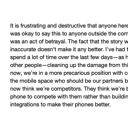 It is frustrating and destructive that anyone here thought is was okay to say this to anyone outside the company. This was an act of betrayal. The fact that the story was inaccurate doesn't make it any better. I've had to personally spend a lot of time over the last few days—as have a lot of other people—cleaning up the damage from this mess. Even now, we're in a more precarious position with companies in the mobile space who should be our partners because they now think we're competitors. They think we're building a phone to compete with them rather than building integrations to make their phones better.