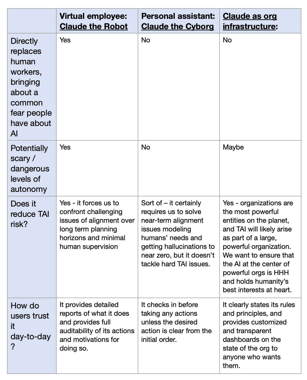 Either Claude as Cyborg or Claude as Org Infrastructure can evolve into Claude the Robot with time, with Claude taking on more aggressive levels of autonomy as we start to feel we have the AI alignment capabilities to support it.
