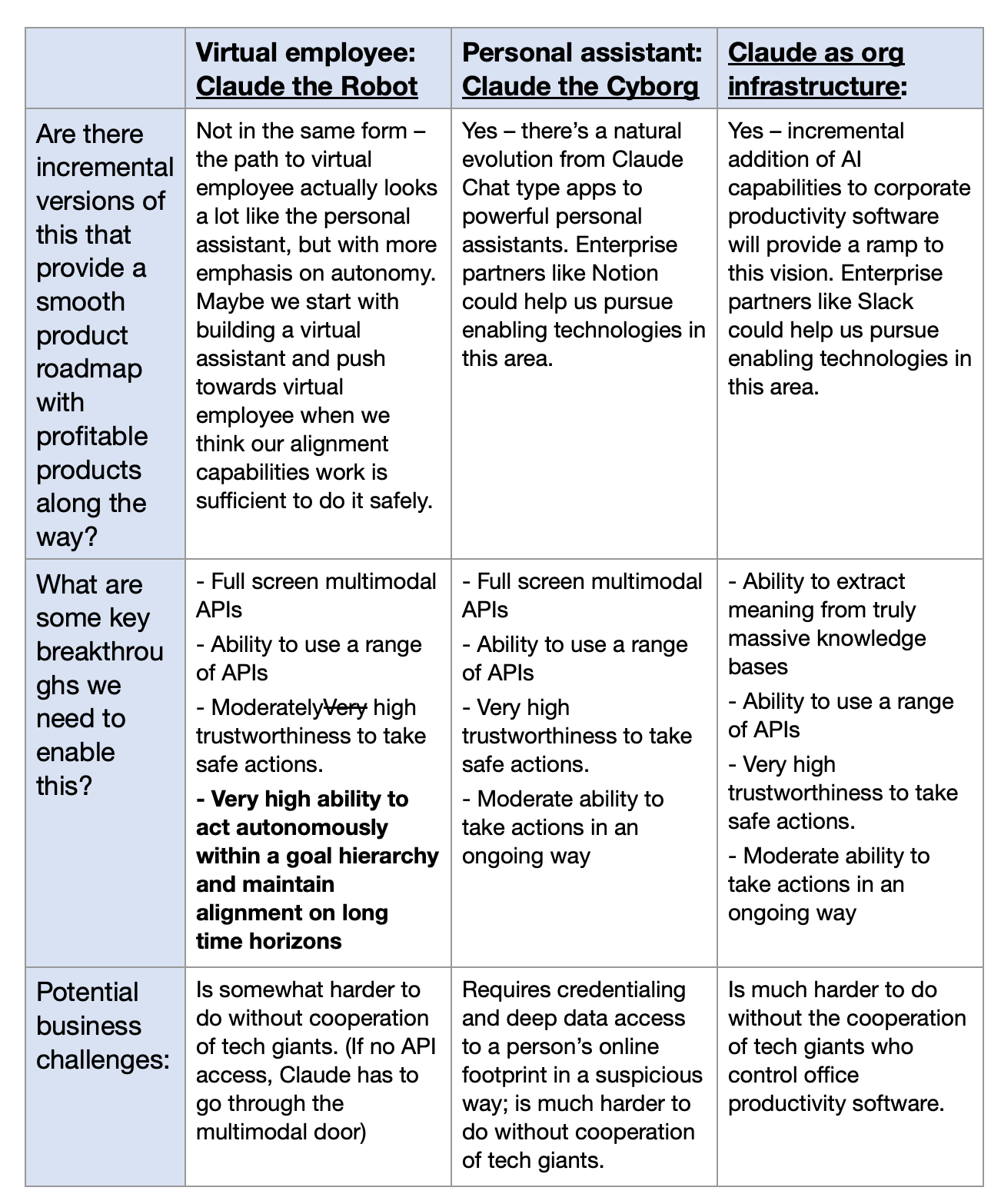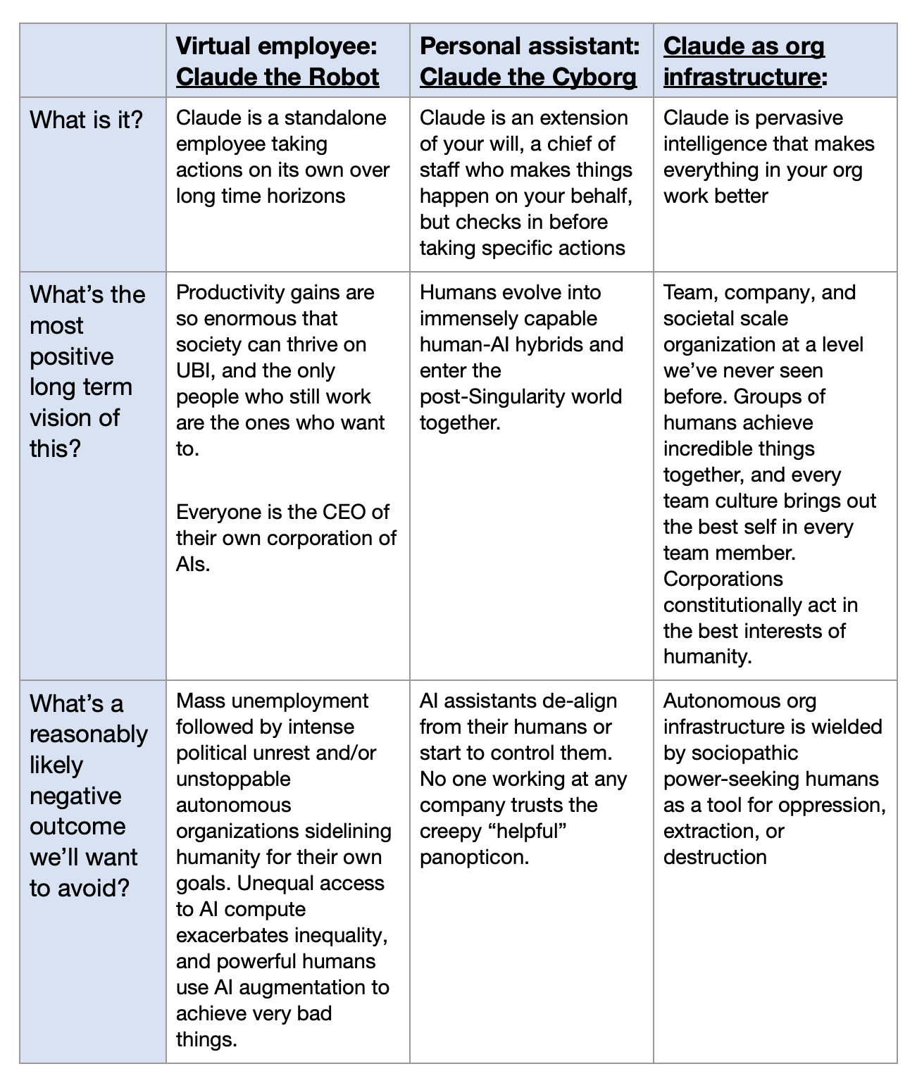Claude is proactive, living collaboration infrastructure that makes everything in an organization better. Existing collaboration tools like Slack and Asana are passive and don’t take anything more than simple actions on our behalf. AI-first versions of these tools would proactively take steps to make organizations and their employees as effective as possible while still respecting everyone’s individual and collective goals. Humans’ abilities to understand what’s happening in large (or even medium size 200 person) organizations is limited. This leads to all the problems we see in larger orgs – siloing, miscommunication, duplication of effort, goal misalignment between teams, factions, execs unaware of what’s actually happening in the org, employees not knowing who to go to in order to get approval for something, etc. Because Claude can consume, understand, and produce information at a much faster rate than humans, Claude is uniquely situated to deal with the information overload that orgs experience. For example, a Claude that could read and understand everything that happens in Slack, Google Docs, and Google Meet could do a wide range of things to help employees be more productive and happier. Since this is a relatively new concept, there are many concrete use cases described at the bottom of the linked doc. Claude the Cyborg and Claude the Robot are both systems that work 1 on 1 with you, whereas this is a system that works 1 on 1 with an entire organization. Claude the Cyborg and Robot differ on the axis of “do you treat it as an intelligent tool, or do you treat it as a standalone entity with its own goals?” as well as “where does Claude operate: your computer or somewhere else?” By comparison, this conception is agnostic to where Claude operates, and instead is opinionated about what Claude focuses on and why: coordination between humans as well as organization and routing of knowledge and insights.